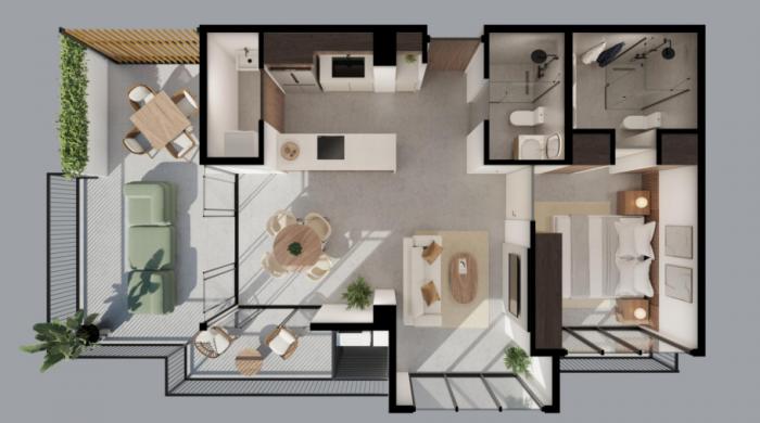 modelo d: desde 59.10?m² · 1?recámara · 2?baños completos · lavandería · balcón o terraza